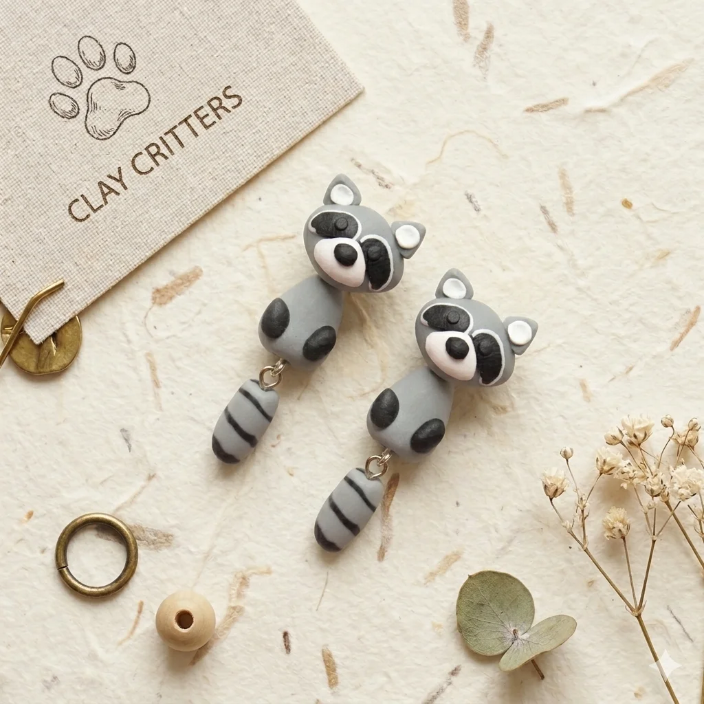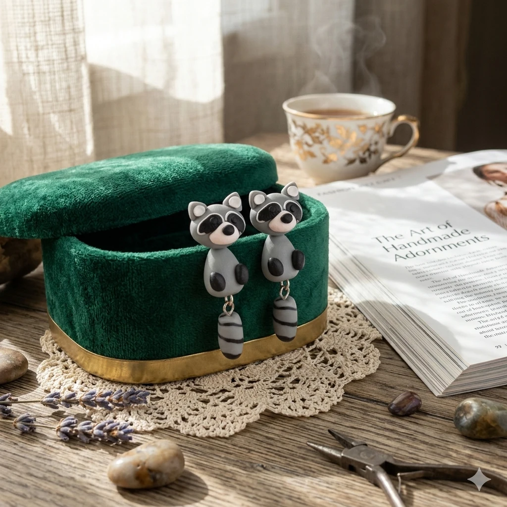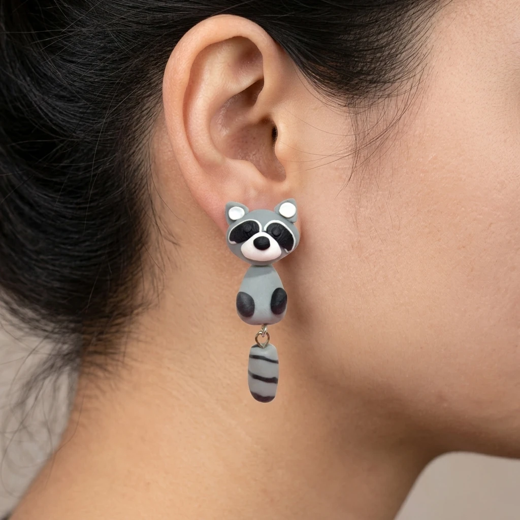 KR26A- Handmade Raccoon Polymer Clay Earrings – Cute Kawaii Animal Stud Jewelry